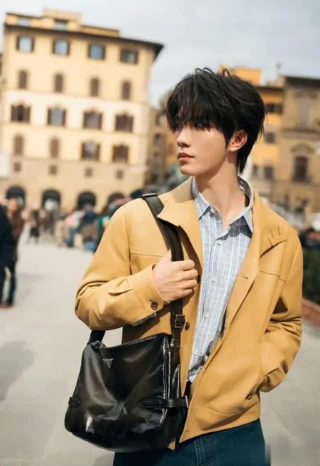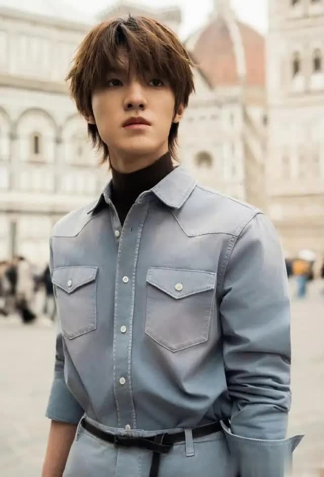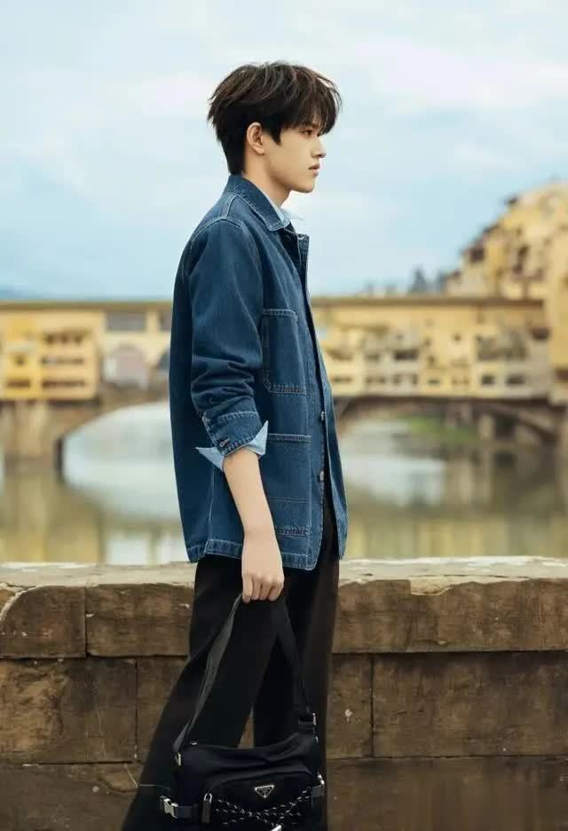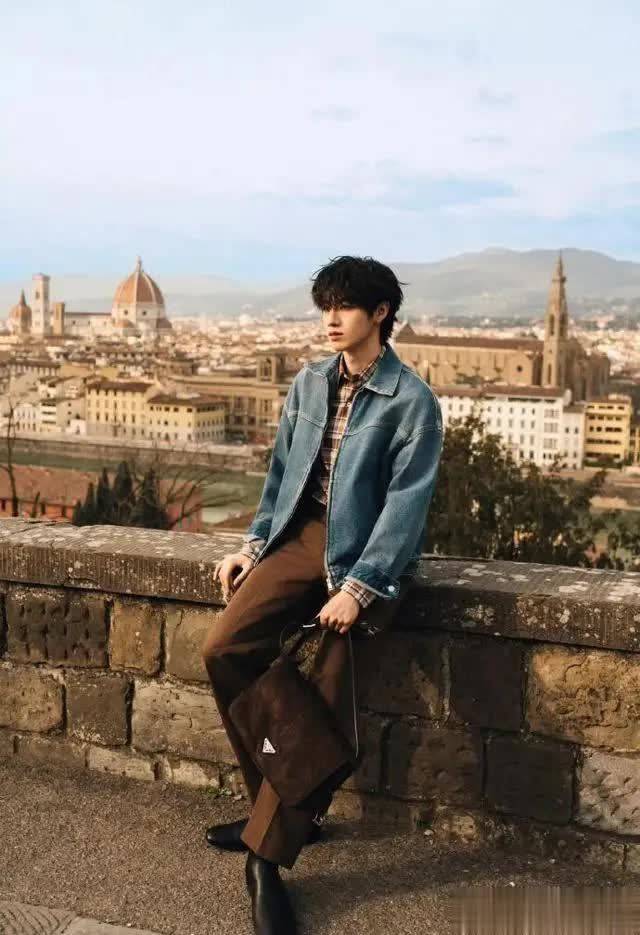 浅蓝牛仔衬衫搭配高领打底,是PRADA标志性的文艺知识分子风,褪去男团舞台锋芒,添几分温润书卷气;针织开衫搭配白衬衫,尽显少年干净温柔,即便站在文艺复兴建筑前,也是自成一道不喧宾夺主的风景。
